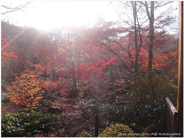入口面西,推開木門冬日午後的陽光從庭園深處照過來。雖然只剩幾株紅葉還堅持著,覆蓋在苔庭上的落葉都轉為深紅,但開門的瞬間、陽光的映照下,即將走入尾聲的楓紅反射出一片紅霧。