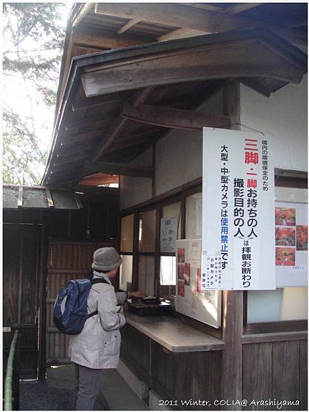 在京都,遇到一些寺院特別貼出腳架禁止的告示 (寶筐院這裡還包括特殊攝影目的者、使用中大型攝影器材者),聽說會這樣規範的原因有三種: 1. 古蹟的木頭地板禁不起腳架的置放與拖移;2. 旺季時觀光客眾多,使用腳架會影響到其他遊客的動線及權益;3. 景點的影像若要被作為商業或其他營利用途的話,好像權利還是屬於景點本身的,所以需要另外跟景點申請,可能也要支付相應的費用吧。